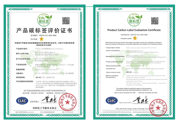 此次碳标签评价表明,南宫28app入口电气生产的户外柱上真空断路产品,在碳排放大数据方面按国际通行惯例推进,并具备一定的优势,对促进产品全供应链的温室气体减排,达成“双碳”目标具有积极作用。此外,南宫28app入口还获中国电子节能技术协会颁发的低碳产品供应商证书。